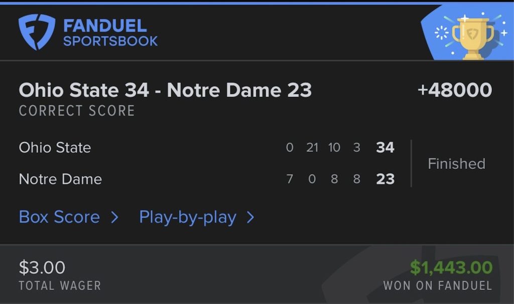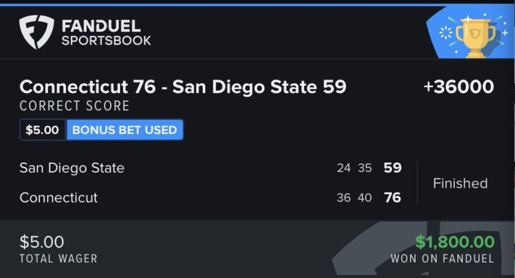 These types of bets are simply a roll of the dice, but that doesn’t mean they’re impossible to hit. In fact, I’ve hit a couple in the last few years, including the 2023 NCAA men’s basketball championship between San Diego State and UConn, as well as the 2025 college football between Ohio State and Notre Dame. If it wasn’t for Indiana’s 4th-quarter field goal against Miami this year, I would have had a chance for another.